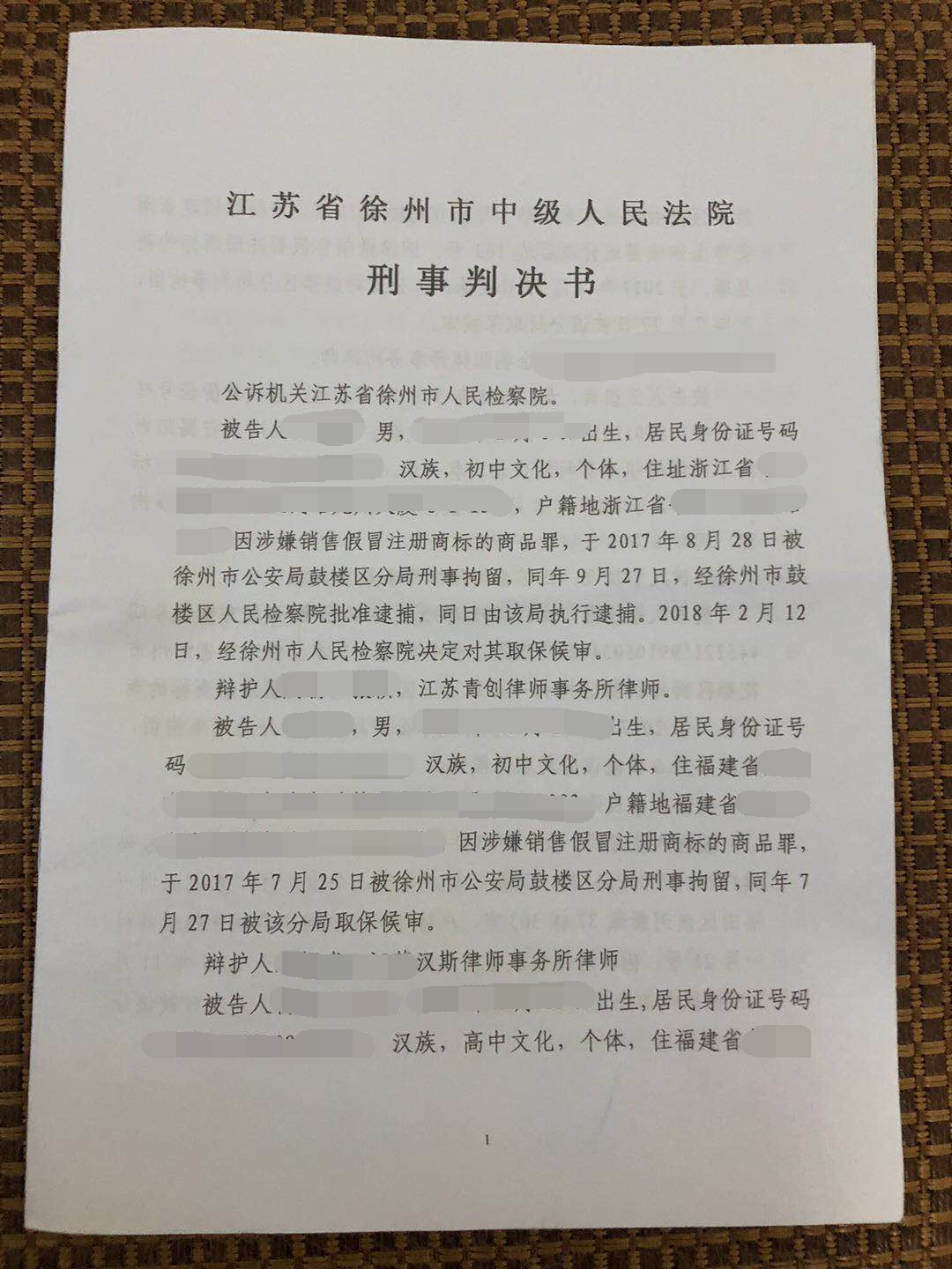 江蘇商標侵權案件判決3人 于2018年7月判決。